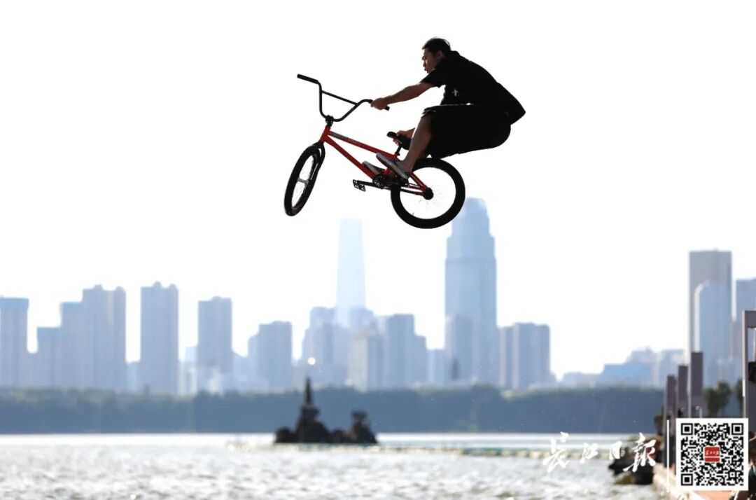 身骑单车,冲坡后纵身跃入东湖,水花四起、阵阵叫好。25日,在位于东湖绿道湖心岛帆船基地火热举行的东湖造浪节,现场欢呼声不绝于耳。
