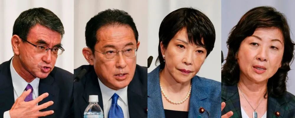 日本自民党总裁选举候选人河野太郎、岸田文雄、高市早苗和野田圣子(从左至右)拼版照片。图片来源:新华社