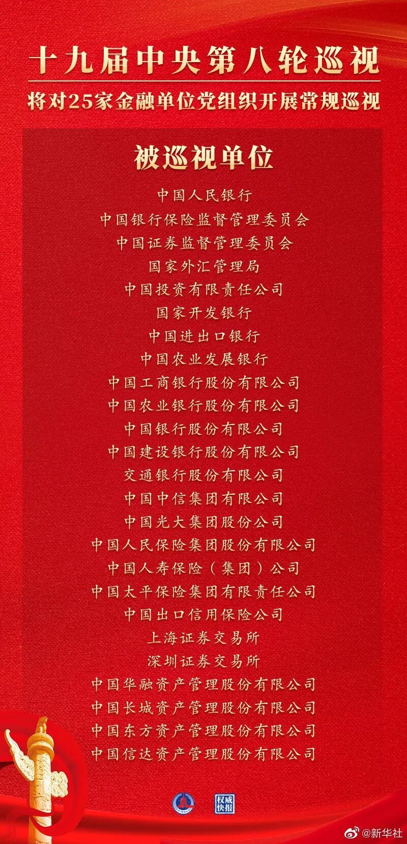 经党中央批准,十九届中央第八轮巡视将对25家金融单位党组织开展常规巡视。