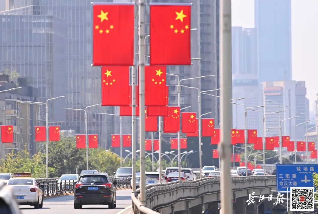 26日,国庆佳节临近,武汉三镇街头国旗迎风飘扬。汉口中山大道、常青路、新华路等主干道,工作人员正在陆续悬挂国旗,营造出浓浓节日氛围。详见>>>