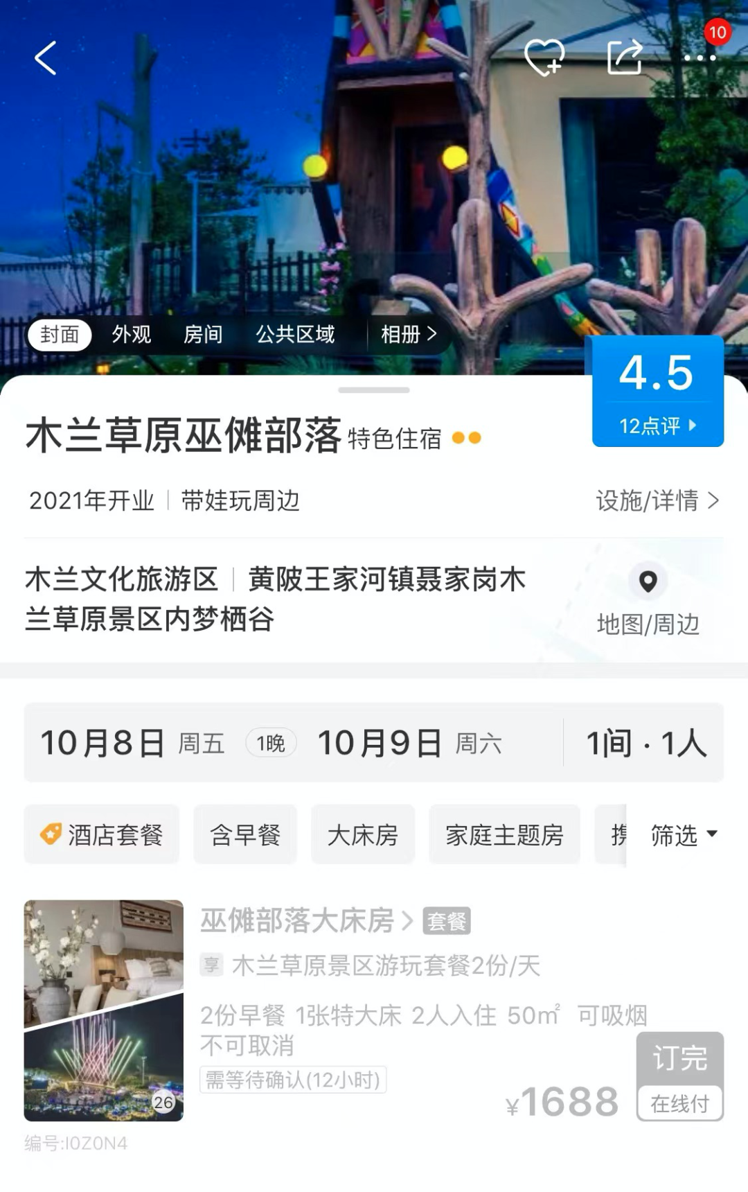 26日晚,小编在某旅游平台查询发现,木兰草原景区国庆假期部分酒店显示“订完”状态。