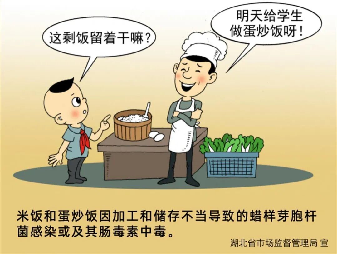 把剩饭留着第二天给学生做蛋炒饭?可得小心了,如果加工和存储不当,可能导致蜡样芽胞杆菌感染或其他肠毒素中毒。10月13日,湖北省市场监督管理局发布了一系列校园食品安全提示漫画。