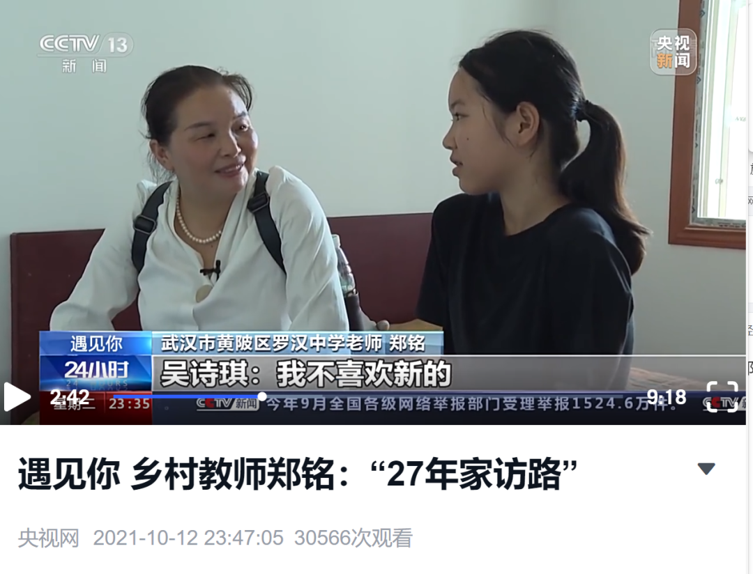 武汉首届“最美教师”、黄陂区罗汉中学教师郑铭坚持家访27年,给留守学生妈妈般的关爱。她的故事经由长江日报记者深入采访挖掘,形成了系列报道,推出后感动了无数读者。近日,中央电视台新闻频道《24小时》栏目报道了武汉乡村教师郑铭的事迹。
