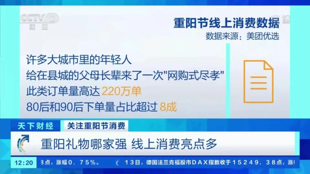 近日,据央视财经报道,在重阳节前夕,许多大城市里的年轻人给在县城的父母长辈来了一次“网购式尽孝”,此类订单量高达220万单,“80后”和“90后”下单量占比超过八成。