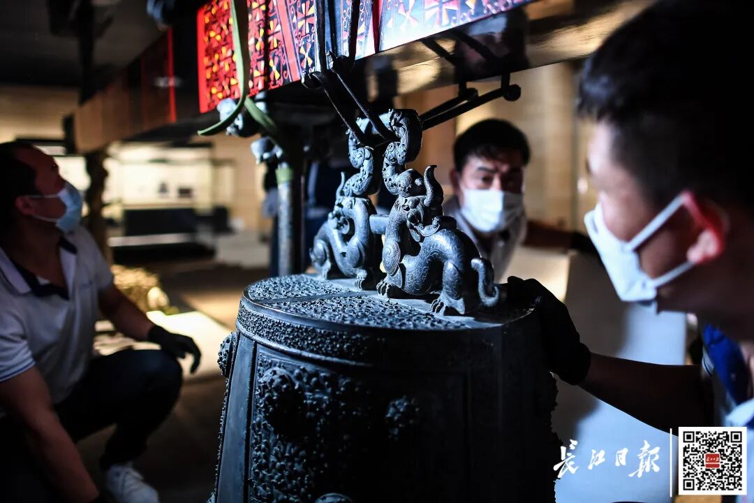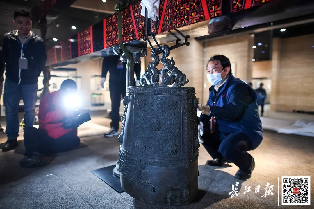 湖北省博物馆馆长方勤(右)查看安装好的镈钟原件。记者任勇 摄