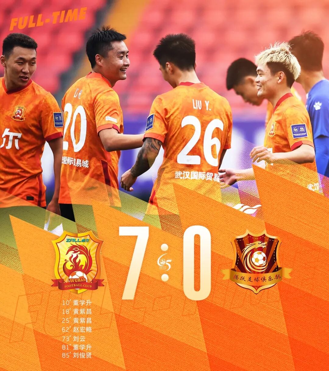 武汉队在昨日进行的2021年中国足协杯正赛首轮比赛中大发神威,7:0横扫来自中乙的对手丹东腾跃后晋级16强,同时也创造了队史最大比分的胜利。