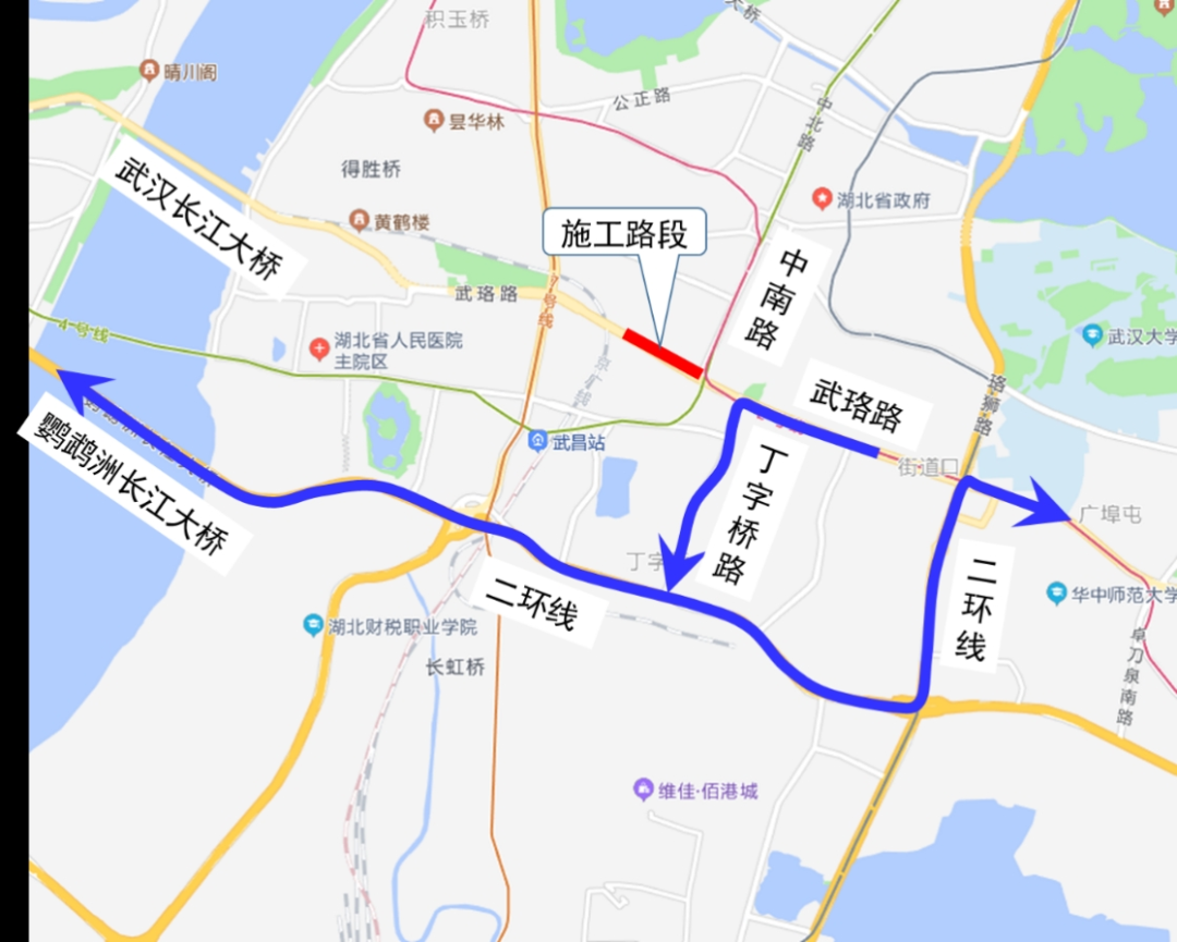 原西向东通过中南一路去往中南路方向的车辆,可通过武珞路五巷、武珞路六巷绕行中南二路去往中南路方向。