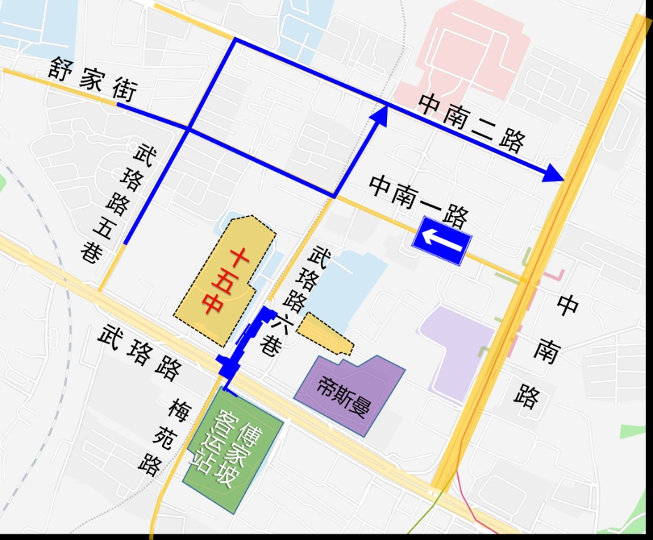 十五中接送车辆临时停靠中南一路、武珞路六巷(十五中宿舍至中南一路);