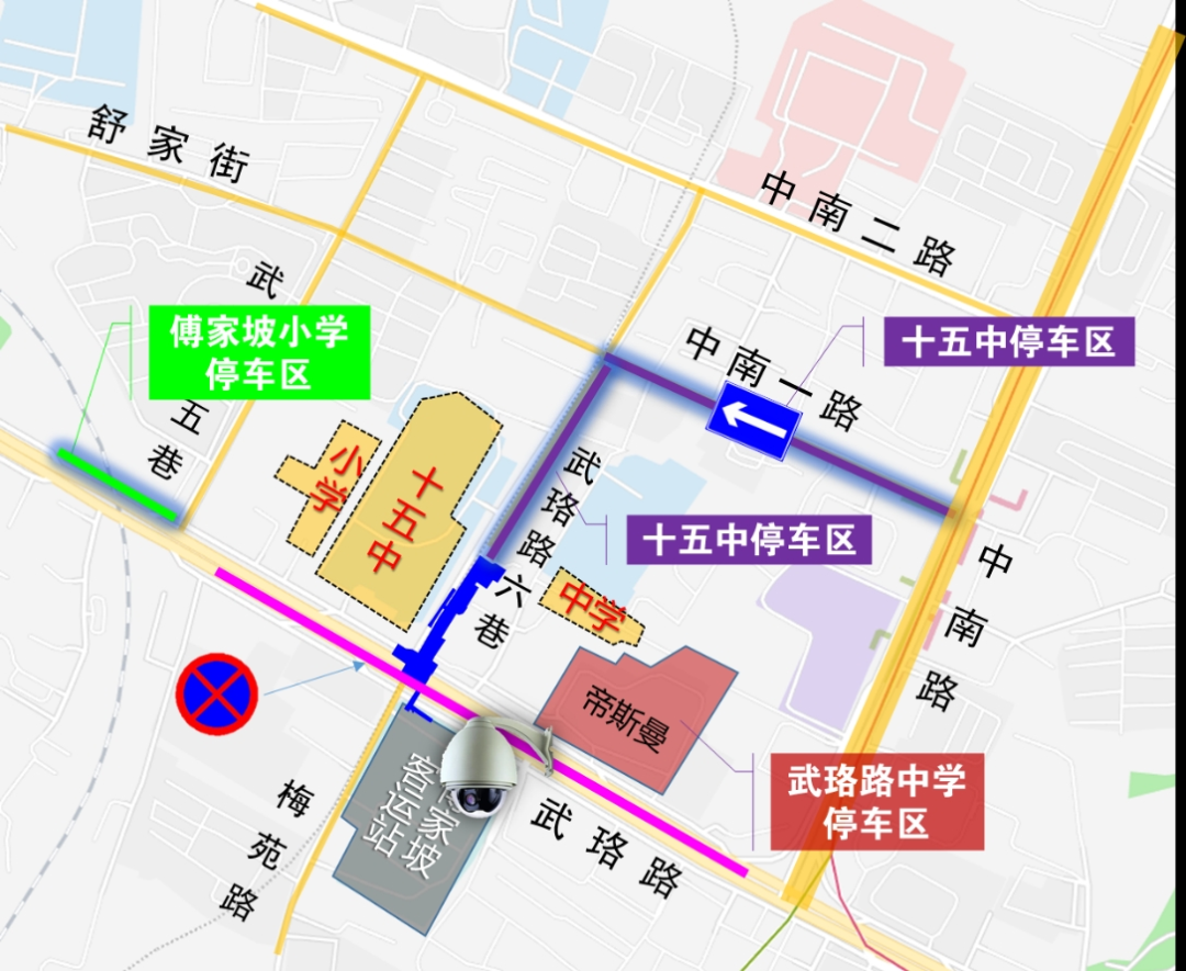 原周边学校接送学生需临时停车的车辆,届时傅家坡小学接送车辆临时停靠武珞路北侧辅道;