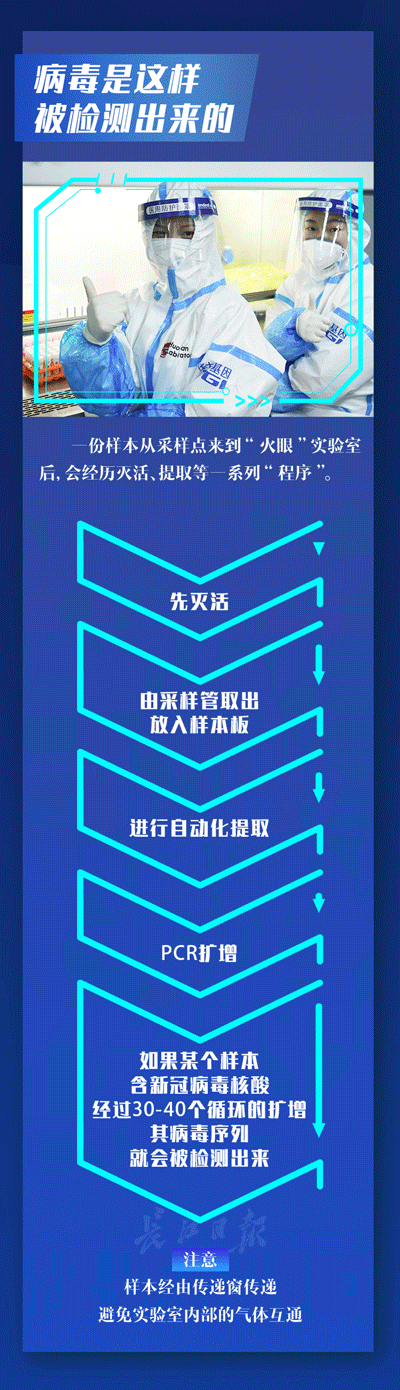 华大基因国内“火眼”实验室总指挥朱师达介绍,样本从采样点送到“火眼”后,先灭活,然后用采样管取出放入样本板,再进行自动化核酸提取、PCR扩增。如果某个样本含新冠病毒核酸,其病毒序列就会被检测出来。