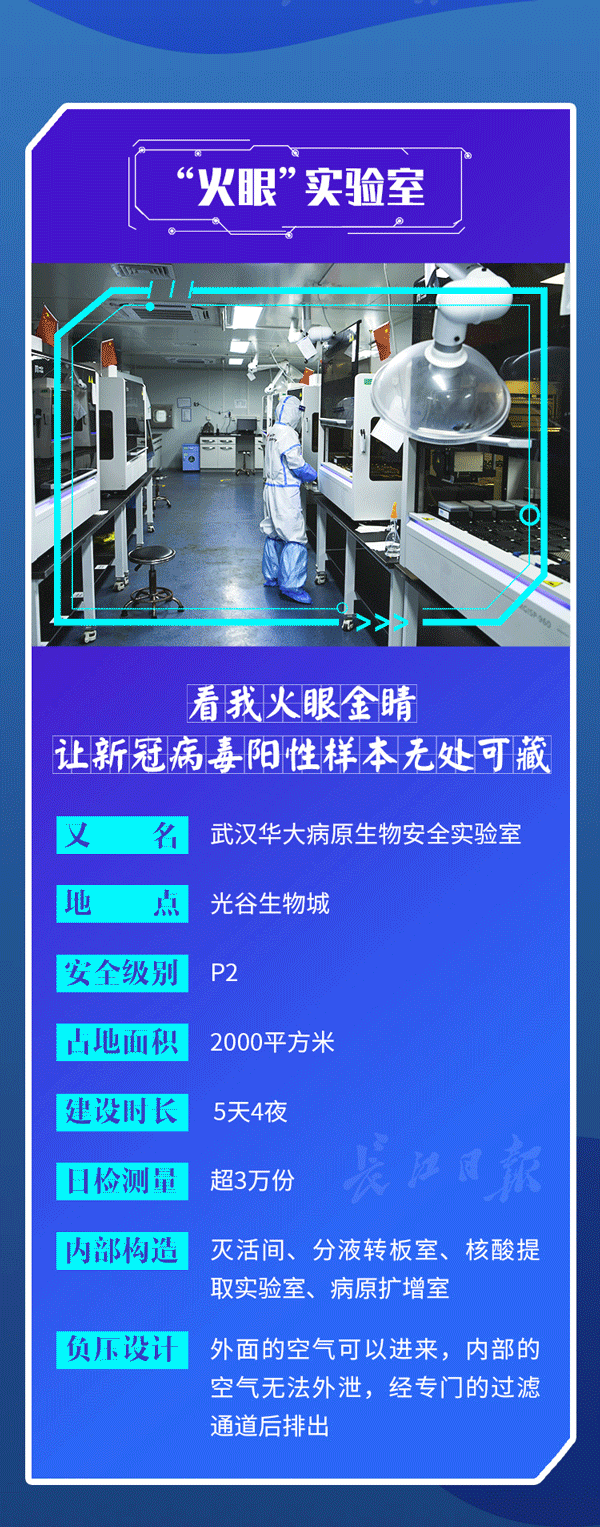 武汉市卫生健康委员会工作人员介绍,“火眼”实验室参与了我市核酸检测“三大战役”,分别是“四类人员”核酸检测、复工复产核酸检测、全市集中核酸检测,它是全市检测能力最强的机构之一,为我市抗击疫情作出了重要贡献。