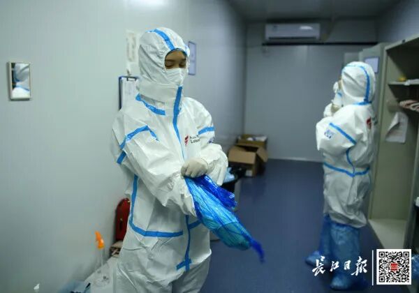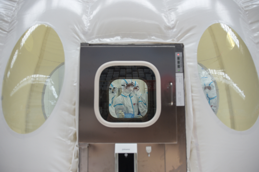“火眼”实验室采用板房材料建造,建在光谷生物城一栋楼的一层。实验室内设置规范,设灭活间、分液转板室、核酸提取实验室、病原扩增室。检验技师着三级防护服,经过缓冲区进入污染区。样本经由传递窗传递,避免与实验室内部的气体互通。