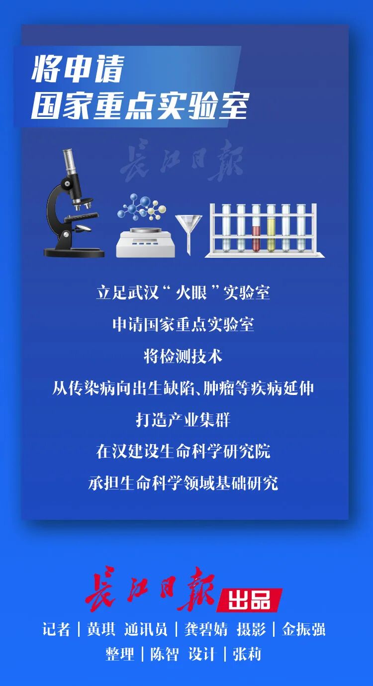 华大基因创始人汪建介绍,华大基因将立足武汉“火眼”实验室,申请国家重点实验室,将“火眼”实验室检测技术从传染病向出生缺陷、肿瘤等疾病延伸,打造产业集群。同时,在汉建设生命科学研究院,承担生命科学领域基础研究,助力武汉重振。