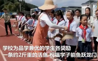 2日,广西柳州市三江侗族自治县古宜镇江川小学举行散学典礼,给200余名品学兼优的学生各奖励一条约2斤重的活鱼,祝福学子能鱼跃龙门,并将获奖的喜悦与家人共同分享。据悉,这是该校第三次在期末给学生奖励活鱼。
