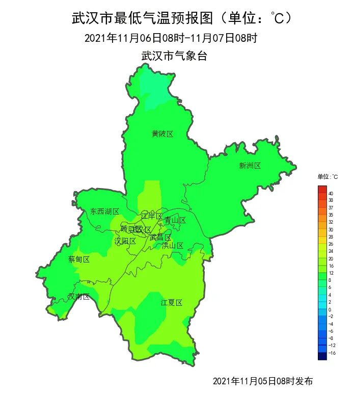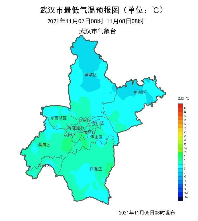武汉市气象台2021年11月05日09时24分发布寒潮黄色预警信号:受强冷空气影响,预计6日夜间至8日,我市将出现寒潮天气,大部地区气温下降9~11℃,最低气温出现在8日早晨为2~4℃,并伴有偏北风4~6级,阵风7~9级,请注意防范!