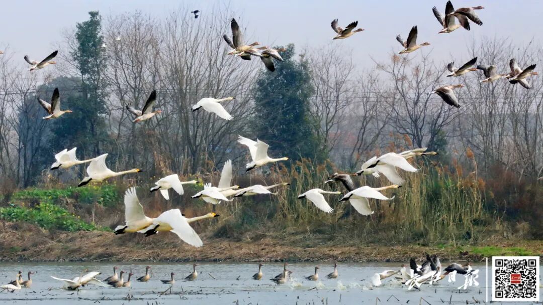 11月9日,东西湖区柏泉府河湿地,一群天鹅和大雁在湖面上嬉水飞翔。通讯员郭贤乐 摄