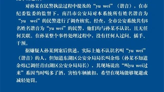 9日晚,南昌市公安局通报“江西玛莎拉蒂女醉驾喊yuwei”事件称:公安系统内6位姓名谐音为“yu wei”的民警均与女车主孙某不认识;与当地公安系统同音领导余炜也“不相关”,孙某因害怕被扣车,而喊了“yuwei”以求规避处罚。