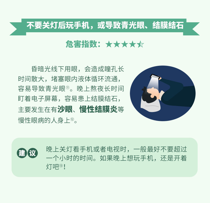 9日晚,#关灯玩手机对眼睛危害有多大#话题登上微博热搜第一。据健康时报,人们长时间在黑暗中玩手机,低频宽条纹闪烁会更加明显,更易加重眼睛负担,引起青光眼、结膜结石等。