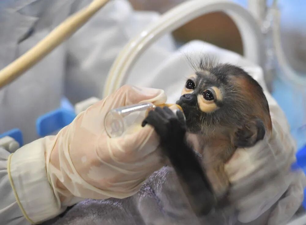 11月10日,广州长隆灵长类研究中心保育员给人工繁育成功的黑腿白臀叶猴宝宝喂奶。来源:央视新闻客户端