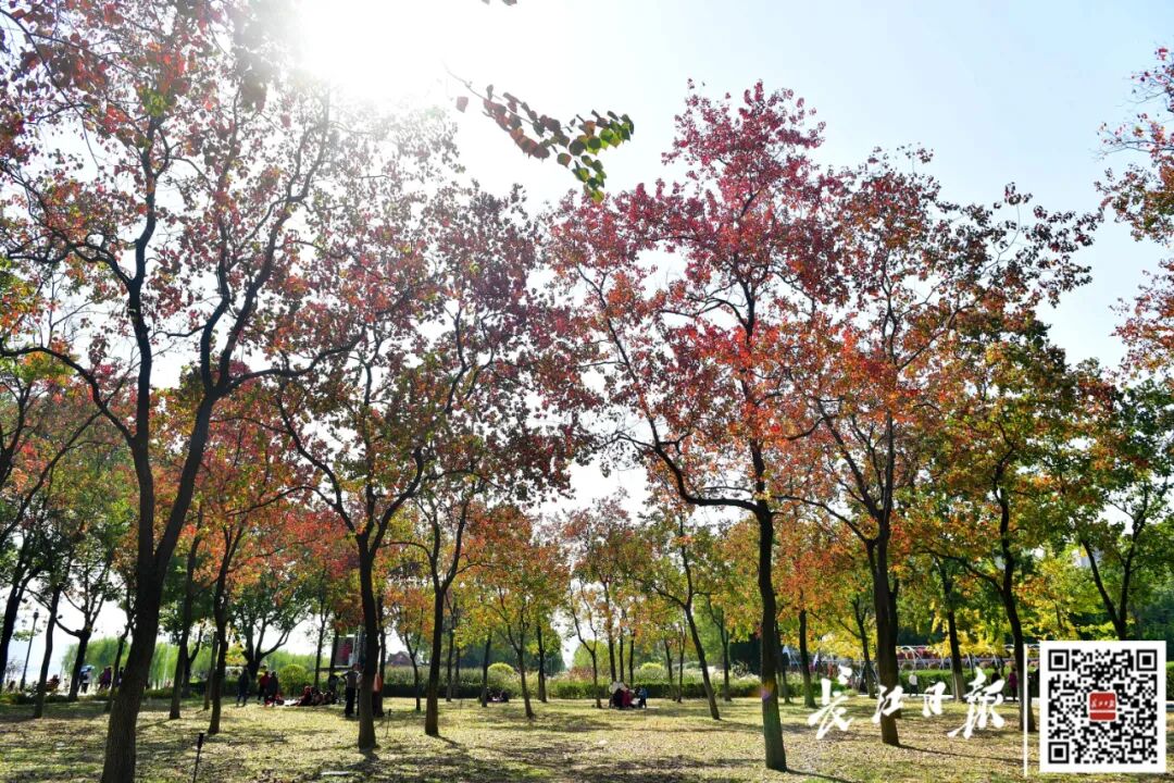 11月11日,暖阳普照。中午时分,汉口江滩红透的乌桕林下,众多市民前来赏景游玩。记者李永刚 摄