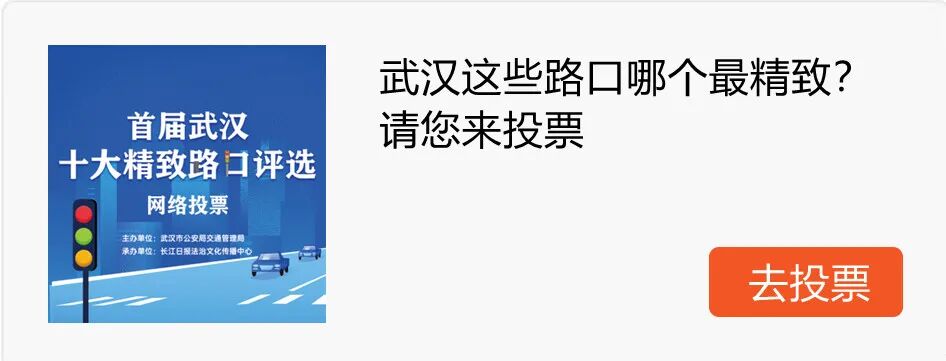 今年,武汉改造了50个路口,哪些更得您心?即日起,由武汉市交管局举办的首届“武汉十大精致路口评选”正式启动,11月11日15时至11月19日15时,市民可以登录大武汉APP,推选自己心目中改造得最成功的路口,每人每天可以为5个路口投票。详见>>>