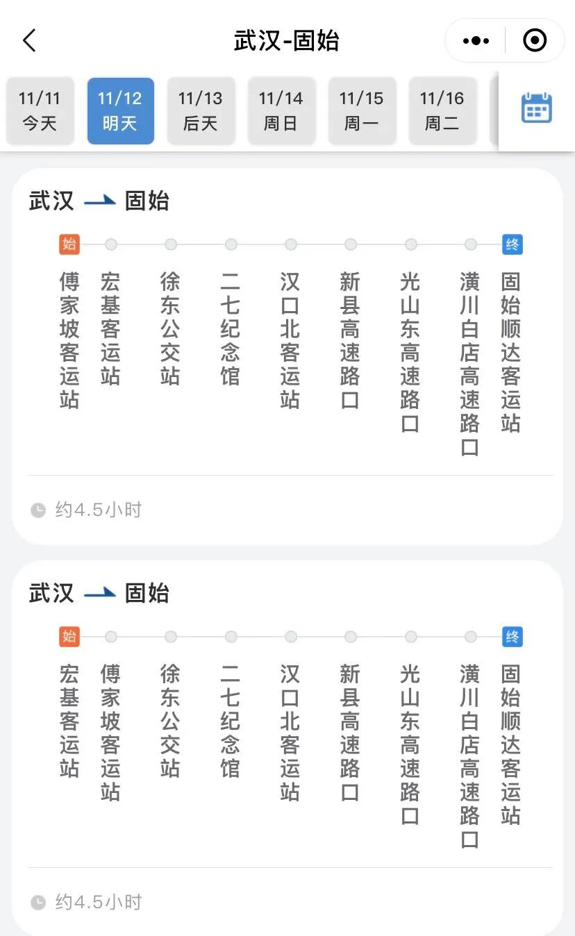 据悉,省客集团首条跨省定制客运班线武汉—固始将于11月12日正式开通营运。该班线全程318公里,运行时间4.5小时,票价127元,每日发送两班车:上午8:00,下午1:40。武汉—固始班线在武汉的乘车点包括:傅家坡客运站、宏基客运站、徐东公交站、二七纪念馆、汉口北客运站。详见>>>