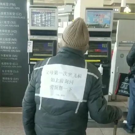 11月24日,在天津滨海国际机场,一位老人身上贴了一张纸条,上面写着“父母第一次坐飞机,如上前询问,劳烦帮一下”。当事人邓女士表示,她父母没有坐过飞机,担心他们年纪大了,在里面找不到方向,就在背上贴了纸条。