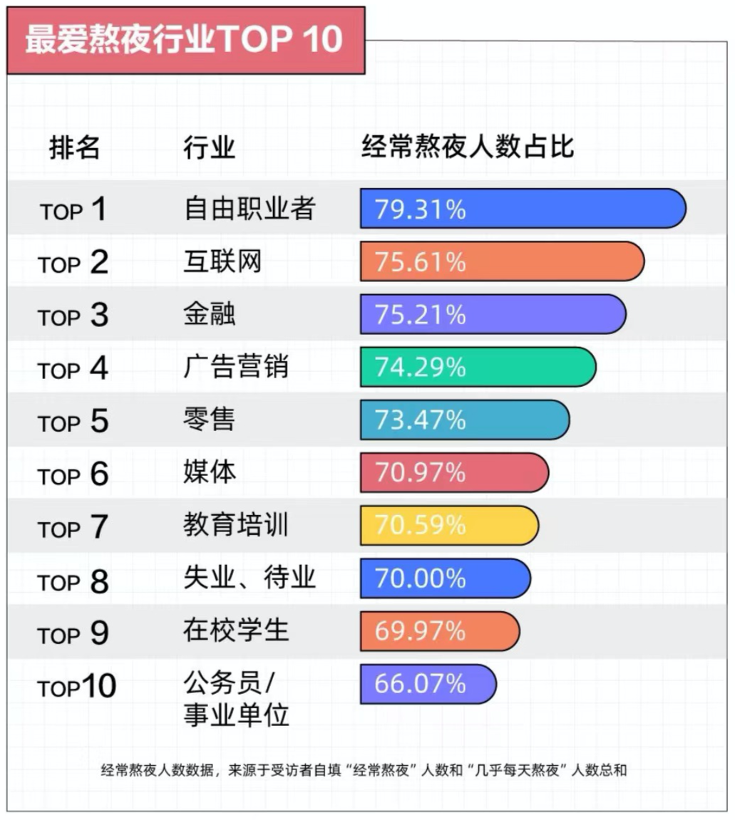 近日某媒体发布的《2021当代年轻人熬夜报告》显示,超八成的年轻人认为晚于零点入睡就算熬夜,超四成年轻人表示几乎每天都熬夜。在“最爱熬夜行业”排行榜中,互联网、金融行业排二三名,第一名你可能猜不到。你是否“身在其中”?