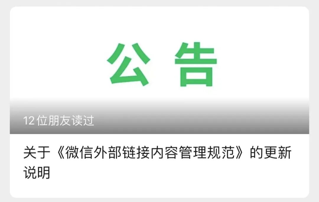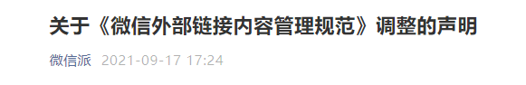 今年9月,微信发布关于《微信外部链接内容管理规范》调整声明称,在监管部门的指导下,微信外链管理措施将分阶段、分步骤实施,第一阶段于9月17日起开始执行。