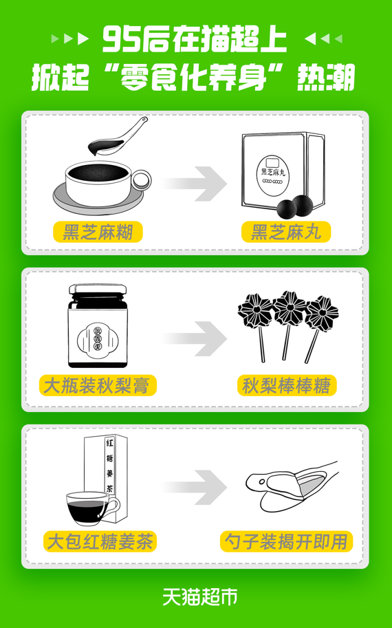 入冬后,不少人将养生提上日程。来自天猫超市的消费洞察显示,保健食品开始“零食化”,95后年轻人成为养生主力。今年11月以来,天猫超市上的便携装的黑芝麻丸、秋梨膏和红糖姜茶销售同比增长达到三倍,其中七成都被新晋的95后年轻家庭买走。你会购买“零食”保健食品吗?