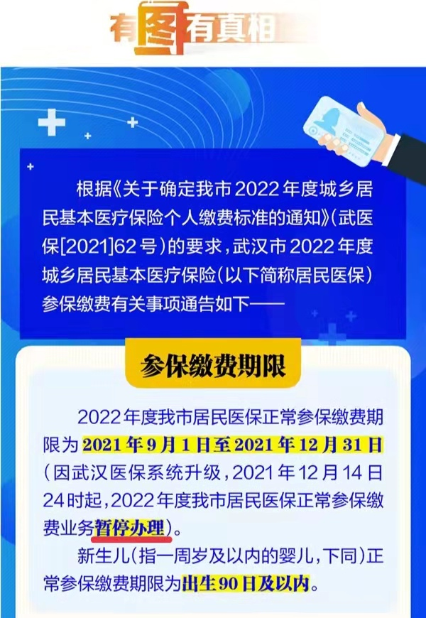日前,武汉市医保局等部门联合下发通知,因全市医保系统升级停机,12月14日24时起,武汉市2022年度城乡居民医疗保险(含大学生)征收业务将暂停办理,请还未缴纳2022年度城乡居民医保的市民在系统停机前及时办理缴费。