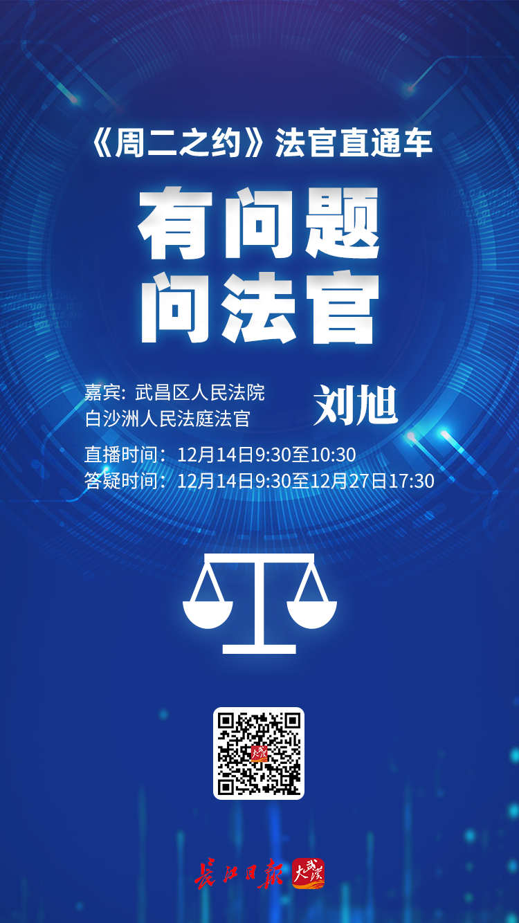 14日9时30分至10时30分,武昌区人民法院白沙洲人民法庭法官刘旭将做客长江日报《周二之约》直播室,为网友解答法律问题(点击上图二维码可在评论区提问),同时将披露一起冻死热带鱼引发业主十余年不交物业费的官司。