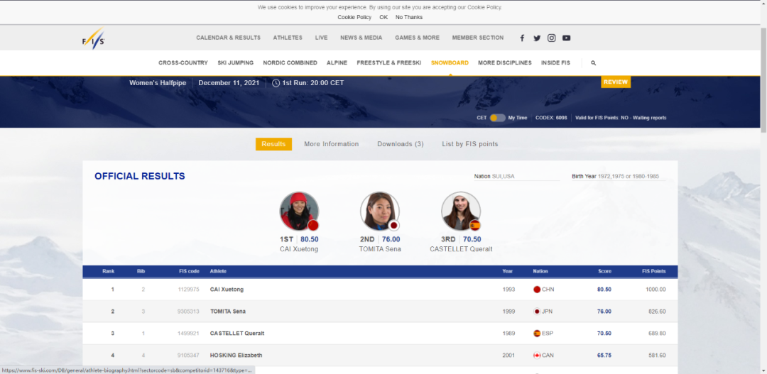 北京时间12日凌晨,在2021/2022国际雪联单板滑雪U型场地世界杯美国铜山站比赛中,中国名将蔡雪桐以80.50分的成绩摘得桂冠。此外,2021/22赛季自由式滑雪世界杯芬兰卢卡站空中技巧混合团体决赛中,由徐梦桃、孙佳旭和齐广璞组成的中国队以354.87分的成绩夺冠。