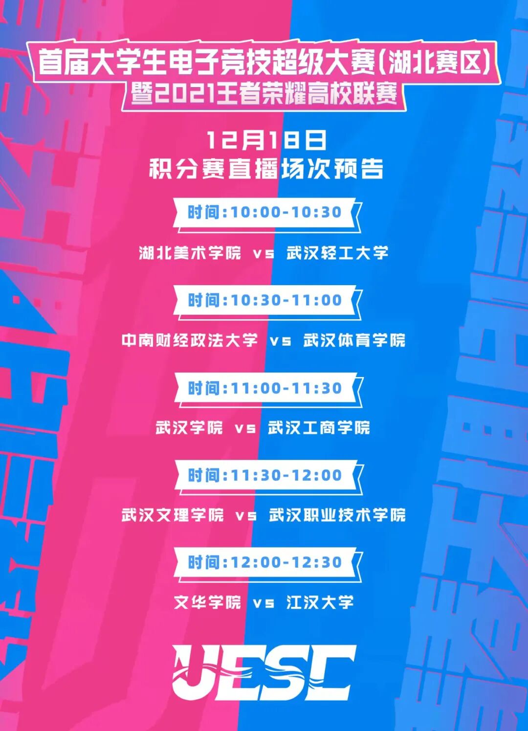 12月17日,首届大学生电子竞技超级大赛(湖北赛区)暨2021王者荣耀高校联赛在武汉东湖学院炫酷揭幕。比赛吸引了包括武汉大学、中南财经政法大学、中国地质大学在内的省内32支高校代表队参加。经过前期的选拔赛,共有24支高校队伍进入积分赛。