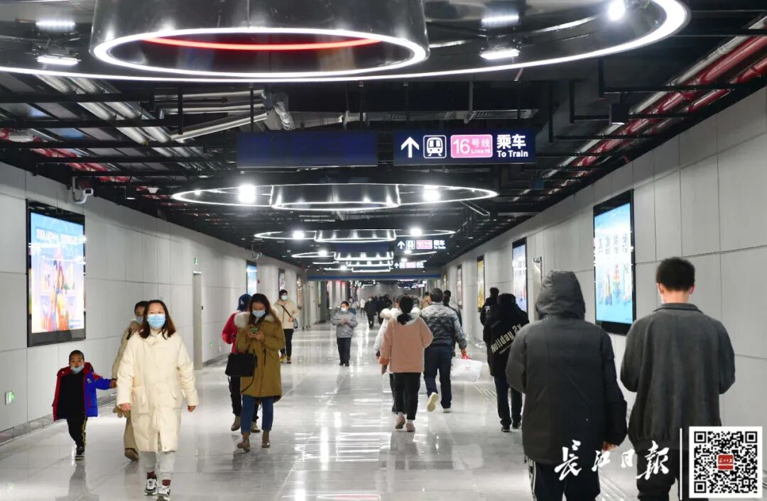 26日,地铁16号线开通试运营。国博中心南站,身着冬衣的乘客经过换乘通道与6号线换乘。记者李永刚 摄