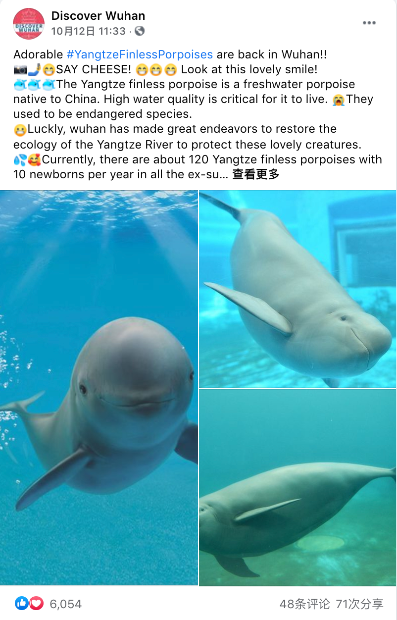 《参考消息》称,在脸书平台上,武汉的江豚、候鸟、小狐狸等生态符号不断刷新网友对武汉的认识。生物多样性大会在云南开幕期间,脸书平台发布的憨态可掬的江豚帖文,阅读量超过20万。