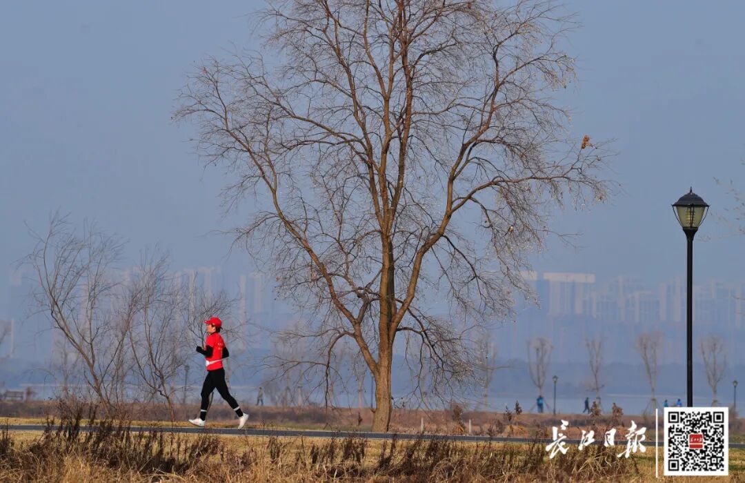 1月3日,武汉天气晴好,居民来到金银湖绿道锻炼,欣赏水天一色的美景。记者李永刚 摄