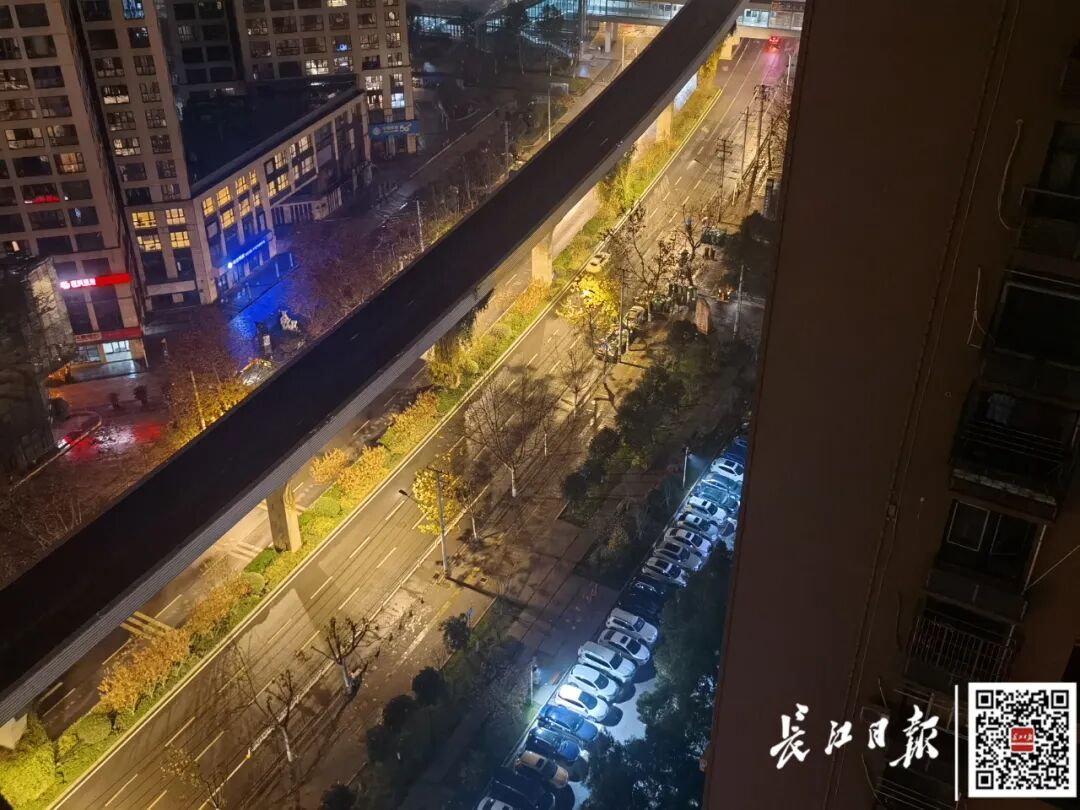 4日0时30分,江岸区三阳路附近,小雨淋湿了地面。曹欣怡 摄