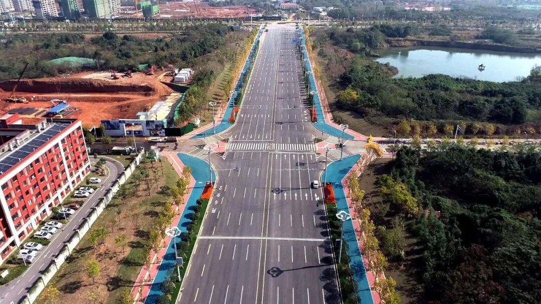 高新二路示范项目西起豹溪路,东至未来三路,分道排项目和管廊项目,道排工程全长10.4公里,主线双向八车道,辅道双向四车道,管廊工程全长10.9公里。