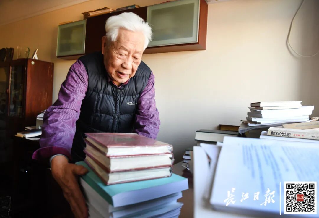 中南财经政法大学退休教授赵德馨在家中书房办公,正在清理案头书籍和资料。记者高勇 摄