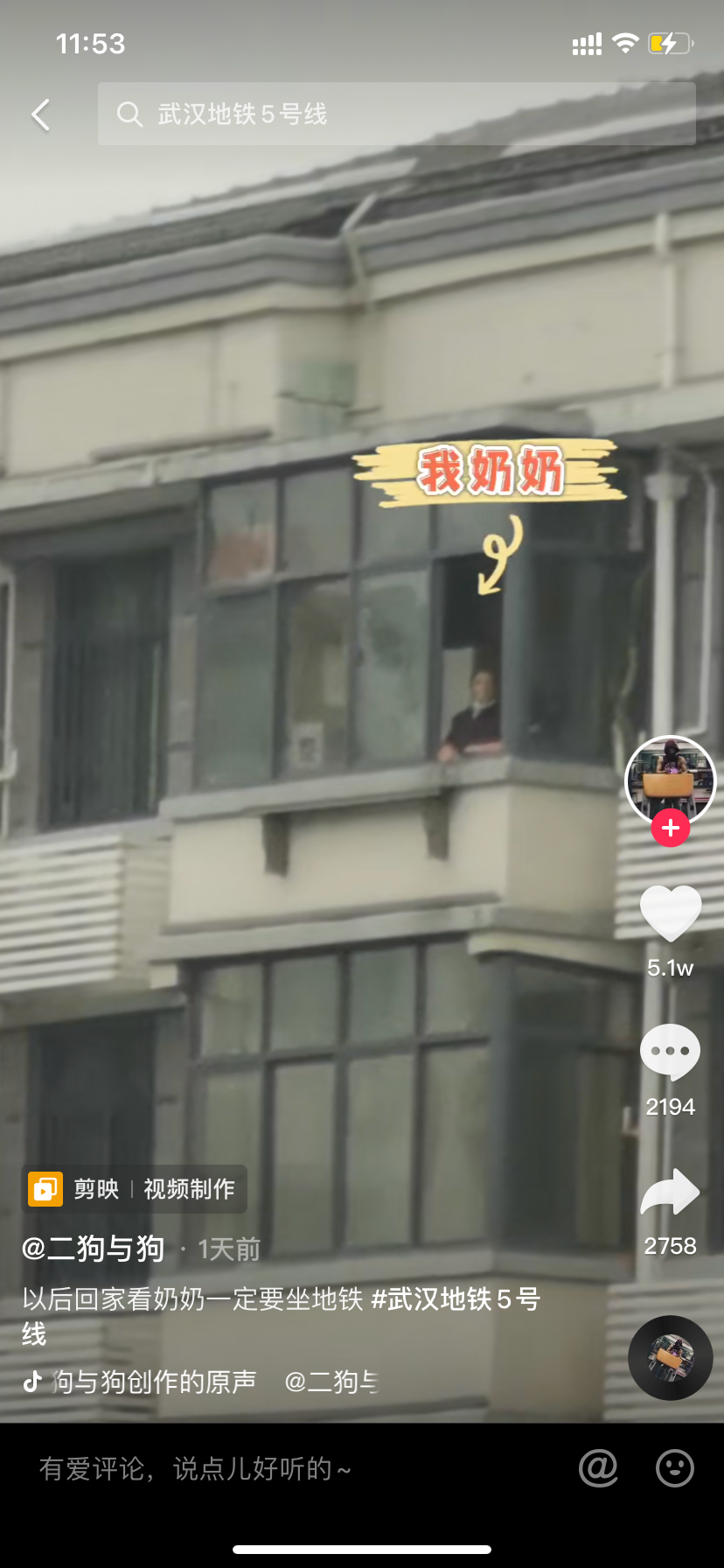 “以后回家看奶奶,一定要坐地铁。”这则短视频里,一名男子说着一口武汉话,站在地铁5号线“司门口黄鹤楼站”的A出入口处,将手机镜头从黄鹤楼摇到地铁站,再摇到不远处的一栋不高的楼房,拉近镜头,可以清晰地看到一位老奶奶正在窗口遥望目送。