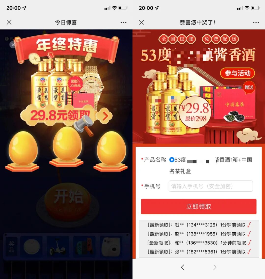 一个名为“取件福利社”的大转盘抽奖活动占比22.11%。其宣传广告语有“抽手机”“待抽取2瓶洗手液”“别扔!扫码抽取5.87元”“抽取保温杯×1”“免费抽3双保暖袜”“待抽取1个电水壶”等。