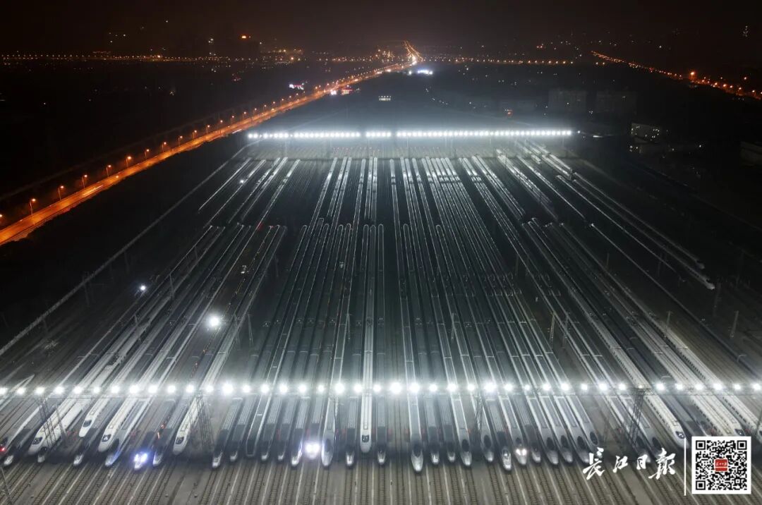 1月16日凌晨2时许,在武汉动车段存车线,一列列完成检修的动车组集结完毕,蓄势待发,迎接春运。记者李子云 通讯员唐宽 摄