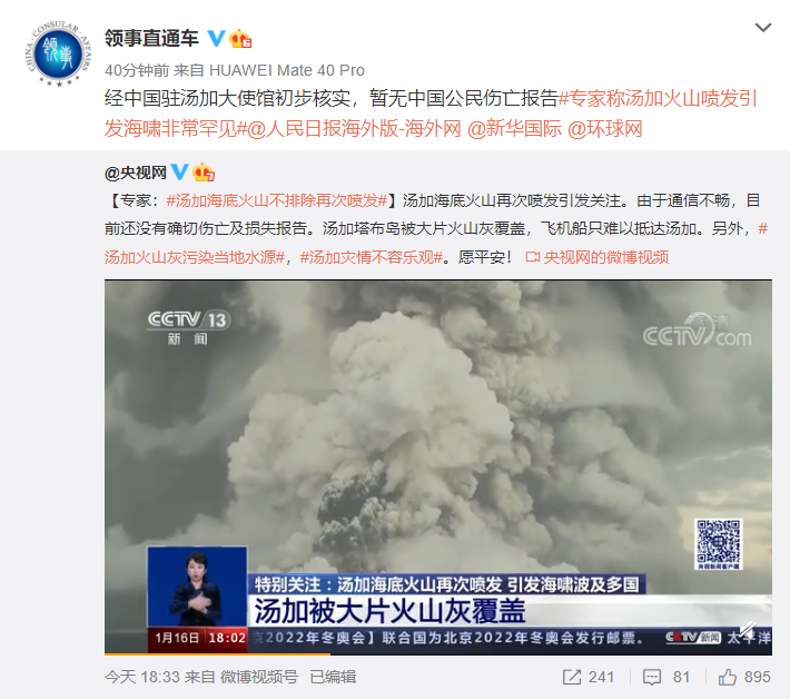 南太平洋岛国汤加的洪阿哈阿帕伊岛14日和15日发生火山喷发,首都努库阿洛法观测到海啸。1月16日,据外交部领事保护中心官方微博消息,经中国驻汤加大使馆初步核实,暂无中国公民伤亡报告。
