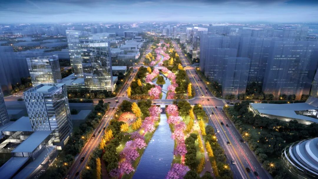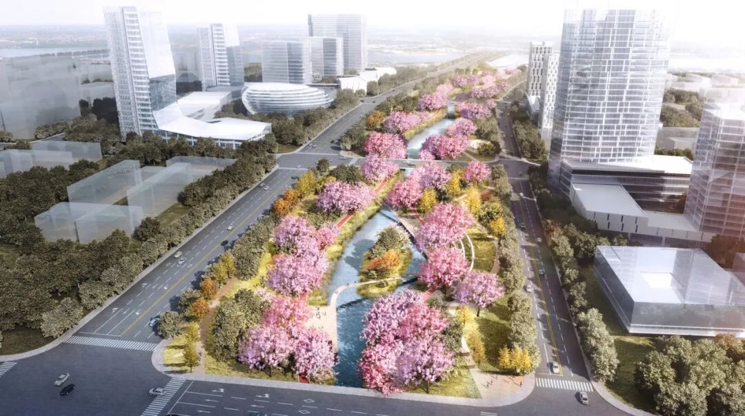 据介绍,东西湖中央明渠樱花溪公园南北向贯穿新城,连接径河、码头潭等生态节点,东至规划径西五路,西接规划径西六路,南达凌云路,北至径河,占地面积约32.62公顷,建设面积30.18公顷。在临空港大道和金山大道生态景观十字轴上,樱花溪公园将呈现“水绿相依、南北纵横”的景观态势。