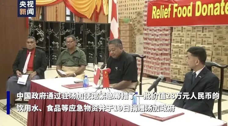 汤加火山1月15日大规模爆发,引发海啸、火山灰等灾害,中国政府通过驻汤加使馆紧急筹措了一批价值28万元人民币的饮用水、食品等应急物资并于19日捐赠汤加政府。汤加国王图普六世表示,中国政府第一时间伸出援手,汤政府和人民被中方义举深深感动,对此深表感谢。汤副首相兼国家应急委员会主席泰伊表示,这是灾害发生后汤加政府收到的首批应急救援物资。当地民众闻讯后纷纷前往中国使馆致谢,动情地表示中国是汤加的真正朋友。