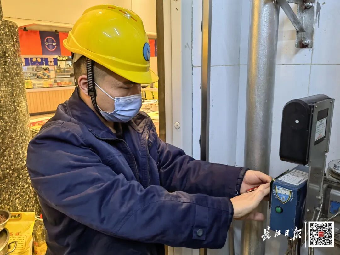 天然气公司员工给工商户表具更换电池。记者龚萍 摄