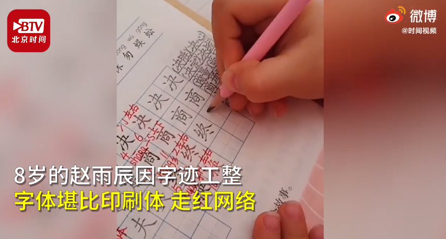 近日,山东济宁,8岁的赵雨辰因字迹工整,字体堪比印刷体走红网络。妈妈称赵雨辰从7岁开始学习练字,现在每天会练字半小时,学习成绩也不错,在班里排名靠前。