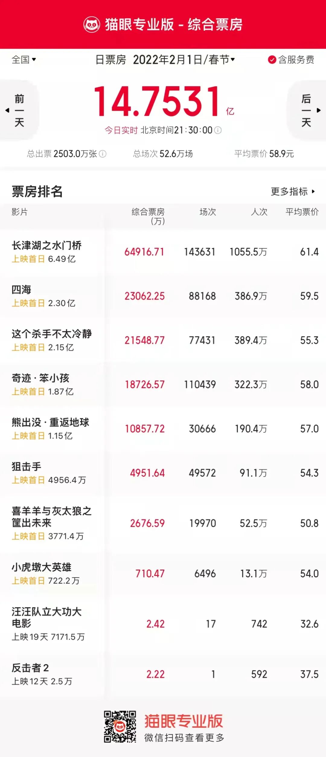 观众如此热情,票房数字自然是节节攀升。据猫眼专业版统计,截至2月1日21时33分,春节档首日票房达到14.75亿元,位列中国影史单日票房第二,仅次于2021年大年初一的16.92亿元;首日场次达到52.6万,刷新中国电影市场单日场次纪录。