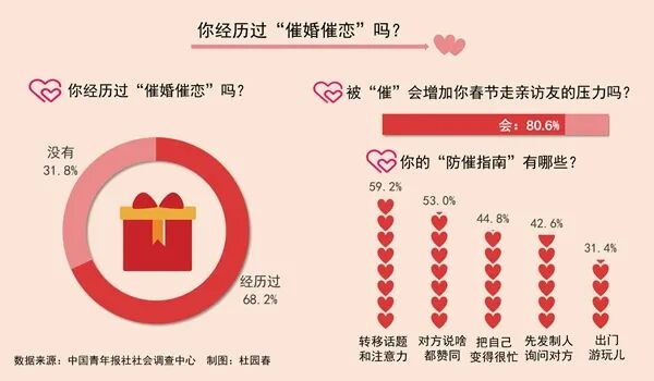 日前,中国青年报社社会调查中心联合问卷网,对2021名未婚青年进行的一项调查显示,68.2%的受访未婚青年都经历过“催婚催恋”。80.6%的受访未婚青年坦言被“催”增加了春节走亲访友的压力。面对催婚催恋,59.2%的受访未婚青年会转移话题和注意力,53.0%的受访未婚青年会无论对方说啥都表示赞同。你经历过“催婚催恋”吗?